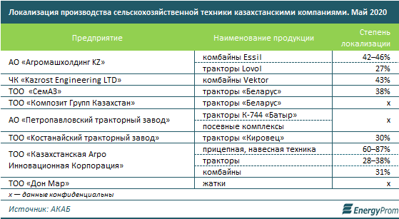 Степень локализации производства в сегменте выпуска тракторов достигает 30–50%, комбайнов — 30–40%, прицепной и навесной техники — свыше 80%. Отечественные компании активно наращивают этот показатель: так, к примеру, уровень локализации по тракторам Lovol (АО «Агромашхолдинг KZ») уже достиг 27%, хотя производство было запущено всего год назад, в 2019-м.