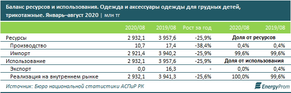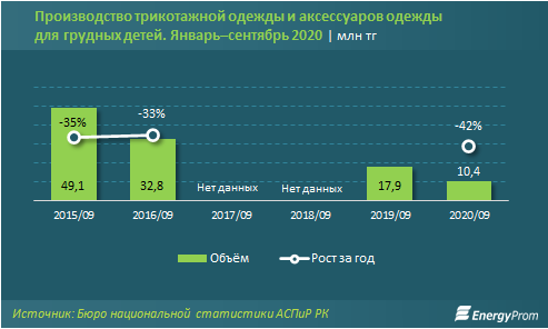 Производство детской одежды, в частности трикотажной одежды и аксессуаров для грудных детей, за январь–сентябрь текущего года составило лишь 10,4 млн тг — на 42% меньше по сравнению с аналогичным периодом 2019-го.