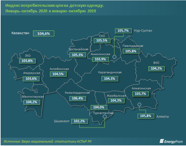 Цены на детскую одежду по итогам января-октября текущего года выросли в среднем по стране к аналогичному периоду 2019 года на 4,6%. Рост ожидаемо был отмечен во всех регионах РК.