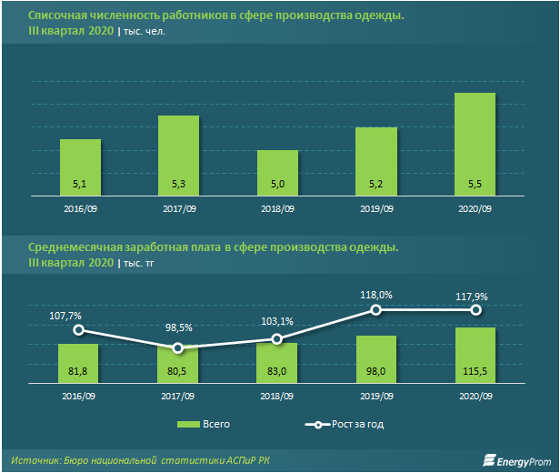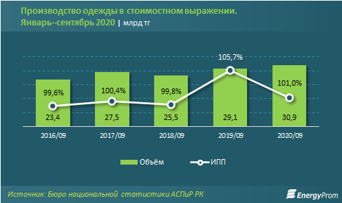В целом объём производства одежды в стране за январь–сентябрь 2020 года в стоимостном выражении достиг 30,9 млрд тг, увеличившись за год на 6,3% (при этом индекс промышленного производства составил 101%).