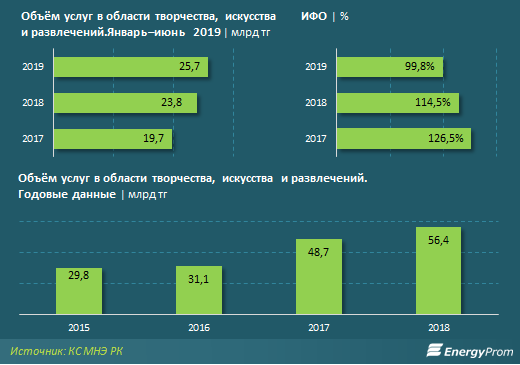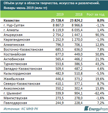 Объём услуг в области творчества, искусства и развлечений за первое полугодие 2019 года составил 25,7 млрд тг, увеличившись по сравнению с аналогичным периодом прошлого года (23,8 млрд тг).