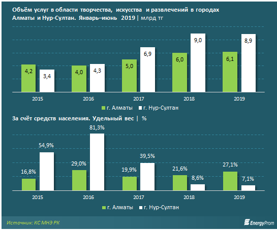 Совокупный объём услуг культурного досуга в обеих столицах — Алматы и Нур-Султане — второй год подряд составляет 15 млрд тг за первое полугодие. Удельный вес двух мегаполисов всегда превышал 50% от совокупного показателя по услугам в секторе. Последние 4 года подряд лидирует Нур-Султан.