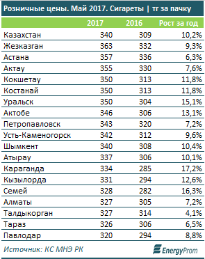 Рост цен закономерен, учитывая регулярное повышение акцизов на табачную продукцию. В этом году по сравнению с 2016 годом они выросли на 24% — с 5000 тенге за 1000 штук до 6200 тенге. В 2018 году ставки планируют поднять до 7500 тенге, в 2019 году — до 8700 тенге.