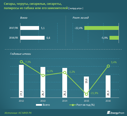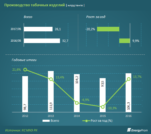 Спад наблюдается и в денежном выражении — так, за январь-май объемы производства табачных изделий составили 26,06 млрд тг, на 20,2% меньше, чем в аналогичном периоде годом ранее.