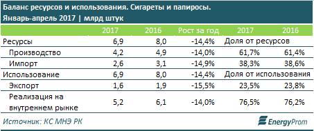 Примечательно, что по данным за 4 месяца текущего года сократилось не только производство, но и спрос: так, реализация сигарет и папирос на внутреннем рынке снизилась на 14% за год. Импорт тоже в минусе — на 14,9% к прошлогодним показателям.