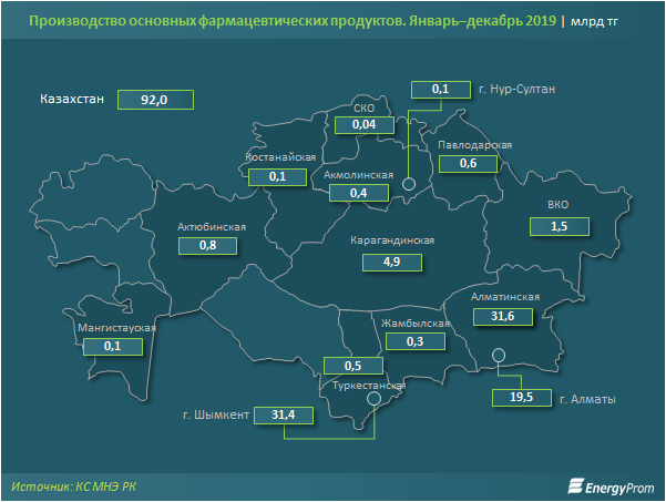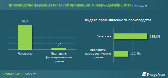 Производство непосредственно лекарственных препаратов за январь–декабрь 2019 года достигло 81,3 млрд тг, прочих фармацевтических препаратов — 5,2 млрд тг.
