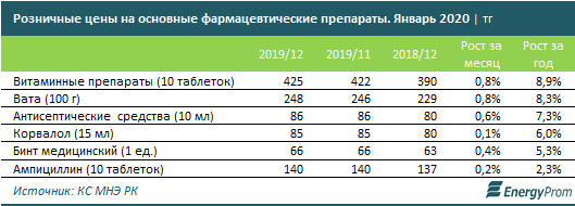 В целом цены на фармацевтические препараты по Казахстану за январь 2020 года выросли на 5,5% к январю 2019-го.