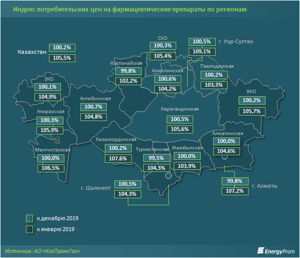 Среди регионов РК наиболее существенное подорожание наблюдалось в Нур-Султане: на 9,1%. Следом идут Кызылординская область (на 7,6%) и Алматы (на 7,2%). Годовое увеличение потребительских цен на фармацевтические препараты было зафиксировано во всех регионах РК.