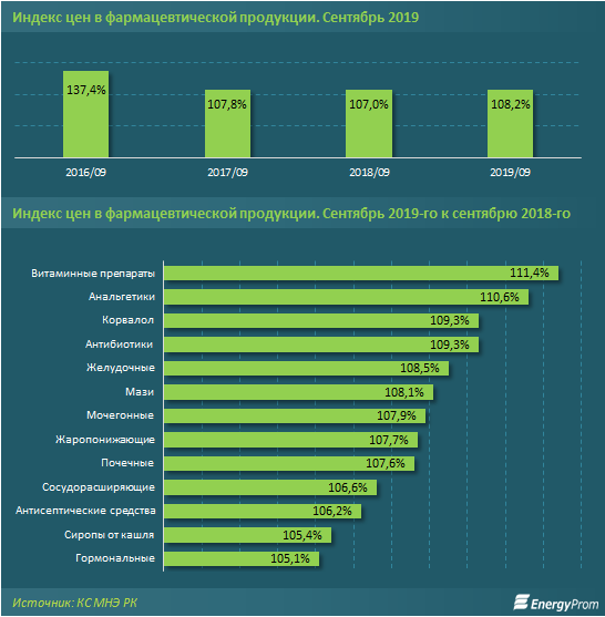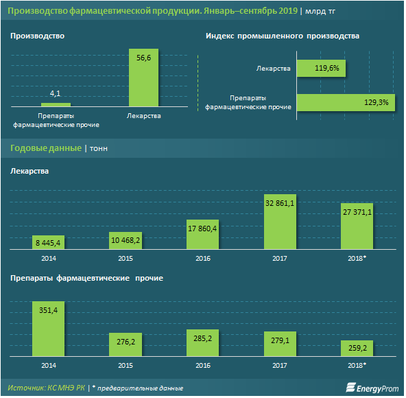 Совокупный объём производства всей фармацевтической продукции вырос с 55,5 млрд тг в январе–сентябре 2018-го до 65,3 млрд тг — в текущем году. Индекс промышленного производства составил 112,5% (годом ранее — 98,4%).