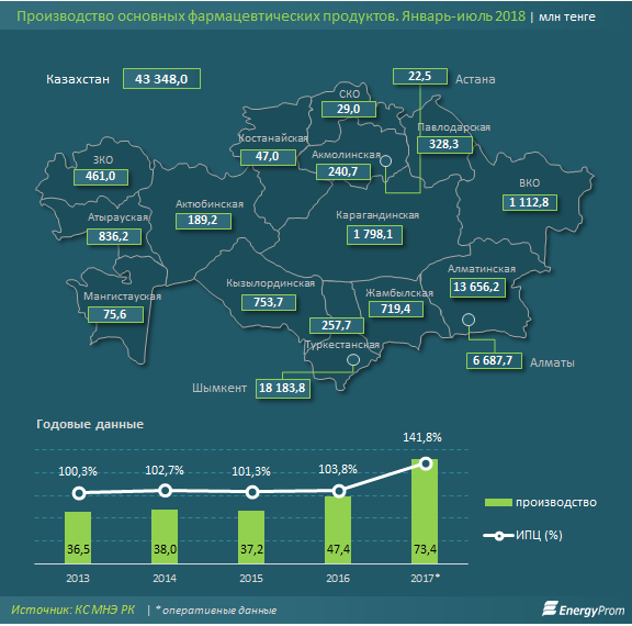 Колыбель казахстанской фармацевтики — юг страны: 41,9% производства пришлось на Шымкент, 31,5% — на Алматинскую область и 15,4% — на Алматы. Совокупно три южных региона обеспечили сразу 89% выпуска в отрасли.