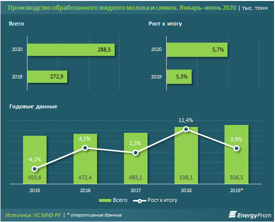 За январь–июнь 2020 года в стране произвели 288,5 тыс. тонн молока и сливок — на 5,7% больше, чем годом ранее.