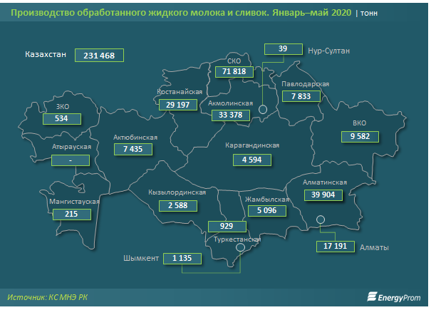 В региональном разрезе наибольший объём производства молока и сливок (по итогам пяти месяцев 31% от РК) приходился на Северо-Казахстанскую область: 71,8 тыс. тонн, годовой рост — на 12,1%. Ещё 17,2% произвели в Алматинской области: 39,9 тыс. тонн — чуть меньше (на 0,9%), чем годом ранее. Замыкает ТОП-3 регионов с долей в 14,4% от РК Акмолинская область: 33,4 тыс. тонн — сразу плюс 26,9% по сравнению с аналогичным периодом прошлого года.