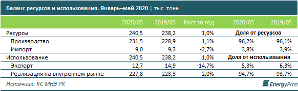 Казахстанские компании обеспечили спрос на молоко и сливки (экспорт плюс реализация на внутреннем рынке) по итогам первых пяти месяцев года практически полностью — на 96,2%. На долю импорта пришлось 3,8%. За год объём импортированного молока сократился на 2,7%, до 9 тыс. тонн. Доля экспорта составила 5,3% — это 12,7 тыс. тонн молока и сливок, минус 14,7% за год.