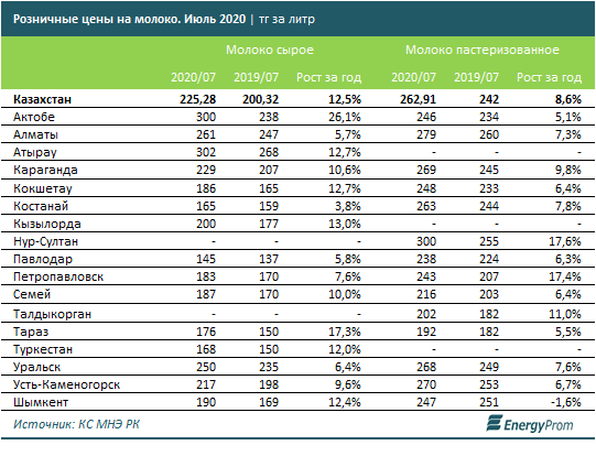 В июле 2020 года на базарах и магазинах страны стоимость сырого молока достигла 225,3 тг за литр, годовое удорожание — на 12,5%. Средняя цена пастеризованного молока в городах РК составила 262,9 тг за литр, годовое удорожание — на 8,6%.