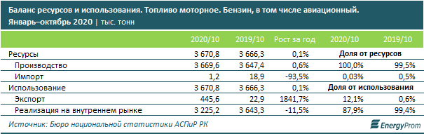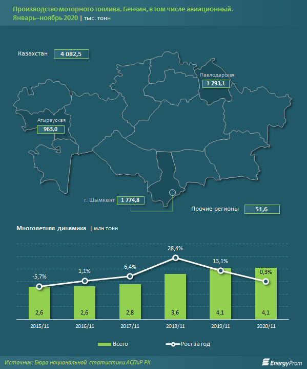 За январь–ноябрь 2020 года в стране произвели 4,1 млн тонн бензина — на 0,3% больше, чем в прошлом году.