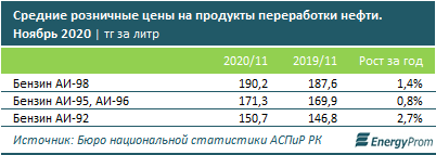 В ноябре 2020 года цены на литр бензина показали незначительный годовой рост: АИ-92 подорожал на 2,7% за год, до 150,7 тг за литр; АИ-95/96 — на 0,8%, до 171,3 тг, АИ-98 — на 1,4%, до 190,2 тг.