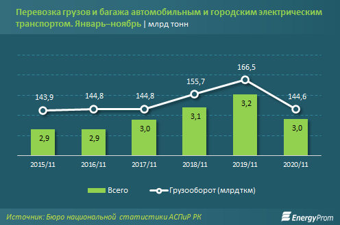 За январь–ноябрь 2020 года автомобильным и городским электрическим транспортом перевезли 3 млрд тонн груза и багажа — на 7,6% меньше, чем годом ранее. Непосредственно в ноябре груза и багажа перевезли 312,3 млн тонн, минус 0,2% за месяц и минус 5% — за год.