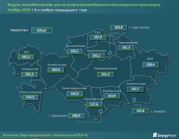 По итогам ноября текущего года стоимость услуг в сфере автомобильных перевозок пассажиров выросла на 5% за год. Наибольшее удорожание услуг ощутили жители Туркестанской, Мангистауской и Жамбылской областей.