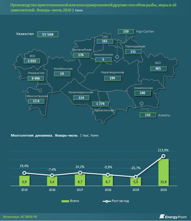 За январь–июль 2020 года производство приготовленной или консервированной другим способом рыбы, икры и её заменителей достигло 15,6 тыс. тонн — в 3,1 раза больше, чем годом ранее.