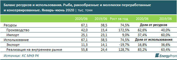 По итогам первого полугодия казахстанские компании обеспечили спрос (экспорт плюс реализация на внутреннем рынке) на переработанную и консервированную рыбу, ракообразных и моллюсков на 62,6%, против 40% годом ранее. Производство выросло за этот период почти втрое к прошлому году, до 42 тыс. тонн. На долю импорта пришлось 37,4%. В Казахстан импортировали 25,1 тыс. тонн продукции в секторе — на 9% больше, чем годом ранее.