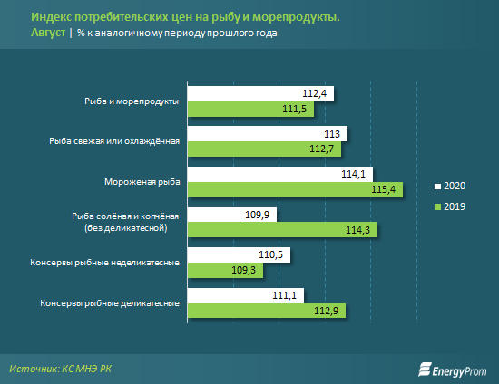 В августе рыба и морепродукты подорожали на 12,4% по сравнению с августом прошлого года. Значительное удорожание наблюдается в Кызылординской (на 18%), Павлодарской (на 16,3%) и Карагандинской (на 15,9%) областях.