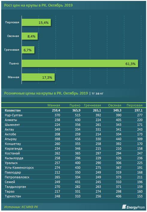 Снижение производства круп в текущем году повлияло на рост цен. Так, к примеру, в октябре 2019 года цена на манную крупу составила 259,4 тг за кг — на 17,3% больше, чем в аналогичном периоде годом ранее (221 тг за кг). Дороже всех манная крупа обходится жителям Атырау (398 тг за кг), Нур-Султана (370 тг за кг) и Актау (349 тг за кг).