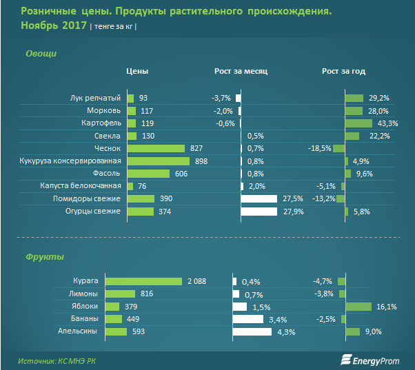 Среди фруктов к декабрю заметно выросли в цене апельсины (+4,3% за месяц, до 592,6 тг за кг), бананы (+3,4%, до 449,2 тг за кг) и яблоки (+1,5%, до 378,5 тг за кг).