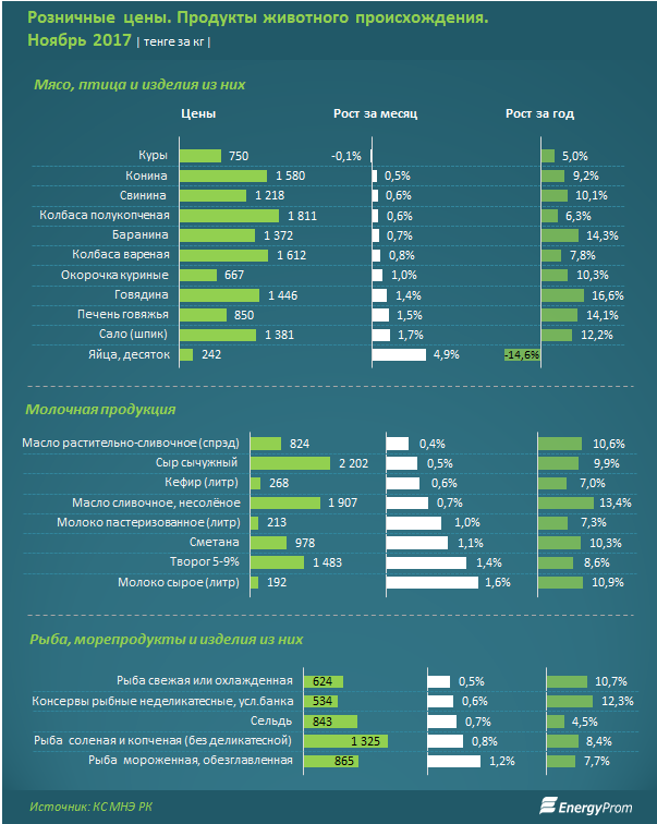 Примечательно, что по итогам ноября среди продуктов животного происхождения сильнее всего из социально значимых товаров подорожали за месяц яйца — сразу на 4,9% к октябрю, до 241,6 тг за десяток.