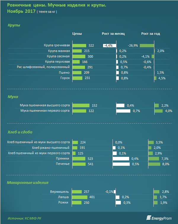 Рос цен на мучные изделия и крупы не превысил 1% за месяц. Более того, например, гречневая крупа продолжает дешеветь: -4,4% за месяц, и сразу 26,9% за год, до 322 тг за кг.