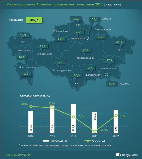 Замыкает тройку лидеров ВКО — 47,3 млрд тг за I полугодие, +31,4% за год. В области работают такие предприятия, как ТОО «Kazakhstan Solar Silicon» (производство электронных деталей), ТОО «Усть-Каменогорский конденсаторный завод», АО «Кэмонт» (производство электрораспределительной и регулирующей аппаратуры), ТОО «Казэлектромаш» «производство прочих видов электропровода и кабеля), ТОО «Георгиевский завод насосного оборудования» (производство вакуумных и воздушных насосов), АО «Усть-Каменогорский арматурный завод» (производство кранов и вентилей), ТОО «Ремонтно-электромеханический завод» (производство подшипников), ТОО «Усть-Каменогорский завод технологического оборудования» (производство фильтрующего и очистительного оборудования), ТОО «Семаз» (производство сельскохозяйственных тракторов), АО «Семипалатинский машиностроительный завод» (производство сельскохозяйственных машин), АО «Азия Авто» (производство автомобилей и других моторных транспортных средств), АО «Семей Инжиниринг» (производство военных боевых автотранспортных средств), и т.д.