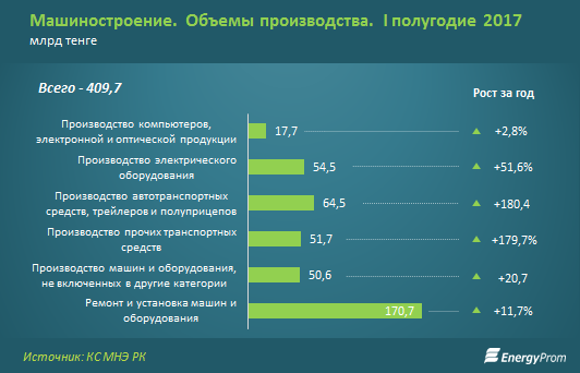 За I полугодие машиностроительные предприятия выпустили продукции на 409,7 млрд тг — сразу на 44% больше, чем годом ранее.