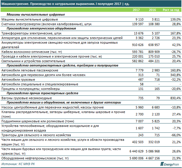 Производство автотранспортных средств, трейлеров и полуприцепов выросло в 2,8 раза, до 64,5 млрд тг, прочих транспортных средств — сразу в 3,8 раза, до 51,7 млрд тг. Более того, председатель правления союза предприятий автомобильной отрасли Казахстана «КазАвтоПром» Олег Алферов сообщил, что производство отечественных автомобилей может вырасти по итогам 2017 года до 15 тысяч машин, что на 36% больше показателя 2016 года. Кроме того, автосборочный завод «Азия Авто» в начале осени 2017 года планирует приступить к выпуску новой модели Skoda Kodiaq, и запускает производство трех обновленных моделей Skoda: Superb, Rapid и Octavia.