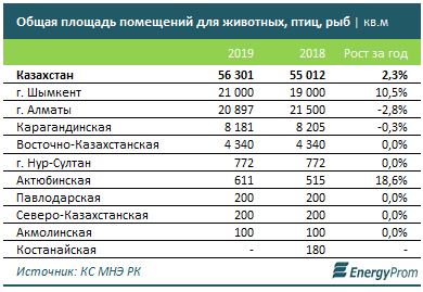 Наибольшая общая площадь помещений для животных, птиц и рыб — у зоопарков Шымкента (21 тыс. кв. м, 1 зоопарк), Алматы (20,9 тыс. кв. м, 2 зоопарка) и Карагандинской области (8,2 тыс. кв. м, 4 зоопарка).