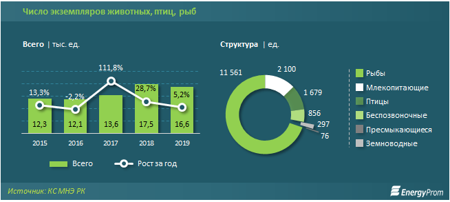 Общее количество экземпляров за 2019 год составило 16,6 тыс. животных, птиц и рыб — на 5,2% меньше, чем годом ранее.