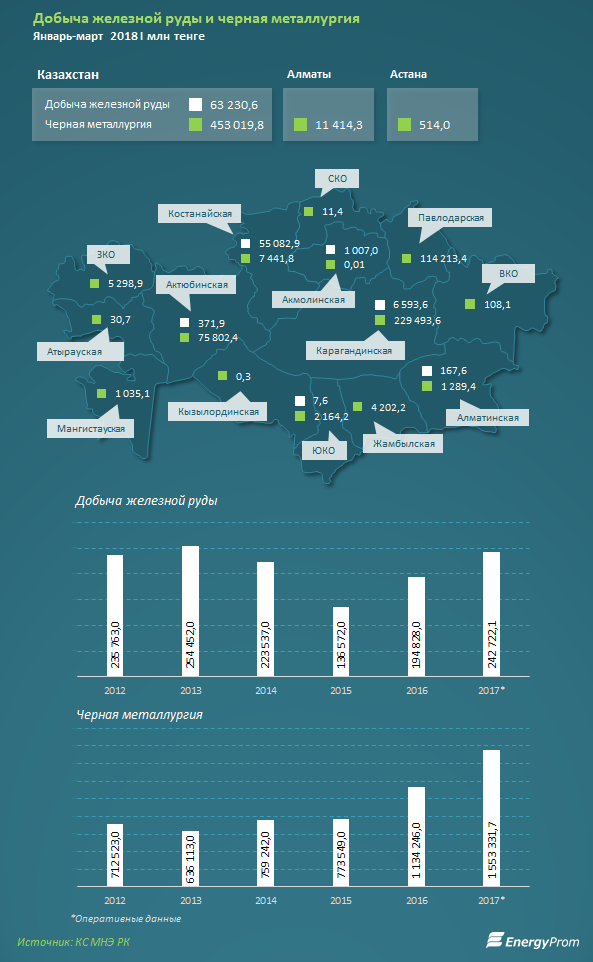 Крупнейший добытчик всех трех регионов — «АрселорМиттал Темиртау», чей железорудный департамент представлен дочерним ТОО «Оркен», объединяющим горнодобывающие предприятия железорудного направления компании.