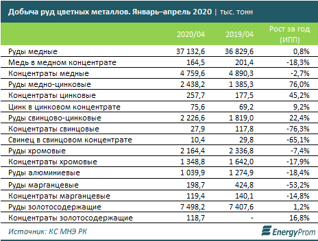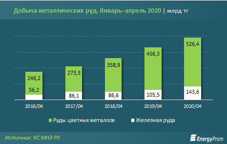 Добыча металлических руд за январь–апрель 2020 года в денежном выражении составила 670,1 млрд тг, рост за год — на 19,3% (индекс промышленного производства — 103,9%). Из них добыча железной руды составила 143,6 млрд тг (+36,1%, ИПП — 115,8%), руд цветных металлов — 526,4 млрд тг (+15,4%, ИПП — 103,4%).