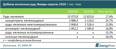 В натуральном выражении добыча железной руды за январь–апрель 2020 года составила более 15 млн тонн, рост за год — на 17,6%. Самый заметный рост добычи зафиксирован для железорудных концентратов: на 25%, до 3,9 млн тонн. Добыча железорудного агломерата выросла на 16,8%, до 1,9 млн тонн.