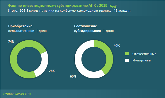 В текущем году, согласно порталу qoldau.kz, на инвестиционные субсидии по статье «Приобретение сельскохозяйственной техники» в текущем году было подано и оплачено 7,5 тыс. заявок на более чем 30 млрд тг — это значительная сумма. Сколько из этих средств ушло на субсидирование импортной техники, точно неизвестно. Например, в 2019 году три четверти приобретённой техники обеспечили отечественные производители, однако сразу 60% субсидий пришлось на импортируемую СХТ.
