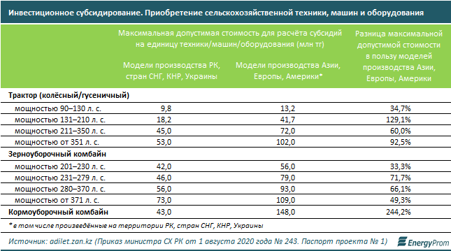 Более того, на импортную СХТ в РК готовы выделить больше средств, чем на отечественную: максимальная допустимая стоимость для расчёта субсидий на единицу техники, машин и оборудования для импортной техники значительно выше, в некоторых случаях — сразу в 2-3 раза. Более высокие субсидии готовы предоставить на импортные тракторы, комбайны, жатки, сеялки, культиваторы и т. д. Приказ Министра сельского хозяйства Республики Казахстан от 1 августа 2020 года № 243 внёс изменения в правила инвестиционного субсидирования, однако не поменял в системе возможность получать немалые средства из казахстанского госбюджета на иностранную технику.