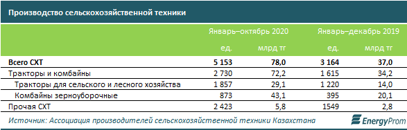 В стоимостном выражении производство сельскохозяйственной техники составило 78 млрд тг, непосредственно тракторов и комбайнов — 72,2 млрд тг, в 2,4 раза больше, чем годом ранее, и в 2,1 раза больше, чем за весь 2019 год.