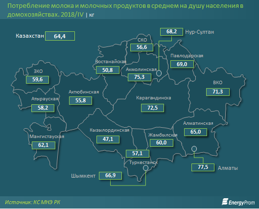 Больше всего молока и молочных продуктов потребляют жители Алматы: 77,5 литров в среднем на душу населения в квартал. Также в тройке лидеров Акмолинская (75,3 литра), и Карагандинская (72,5 литра) области.