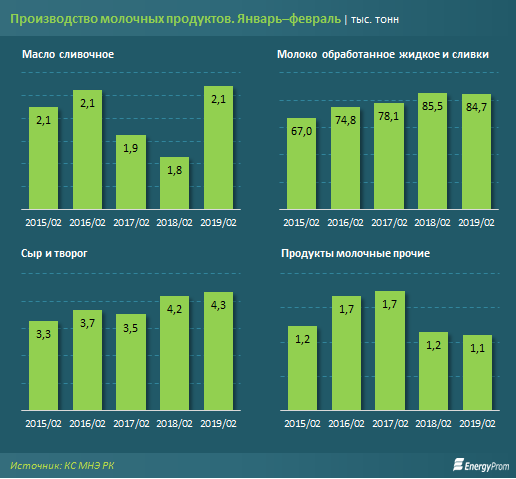 В то же время при росте потребления среди молочных продуктов за январь–февраль 2019 года, по сравнению с аналогичным периодом прошлого года, увеличилось лишь производство сливочного масла — на 16,9%, до 2,1 тыс. тонн, а также сыров и творога — на 3,6%, до 4,3 тыс. тонн.
