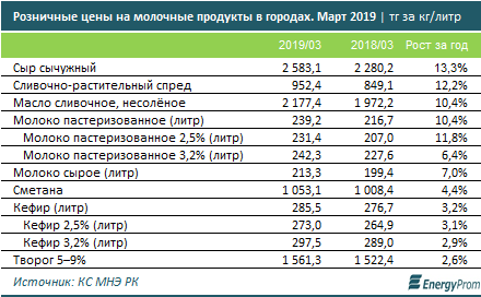 Так, хотя общий уровень инфляции по стране держится на уровне порядка 5%, в то же время сыр подорожал за год сразу на 13,3%, до 2583,1 тенге за килограмм; сливочно-растительный спред — на 12,2%, до 952,4 тенге за килограмм; сливочное масло — на 10,4%, до 2177,4 тг за килограмм; пастеризованное молоко — на 10,4%, до 239,2 тг за литр.