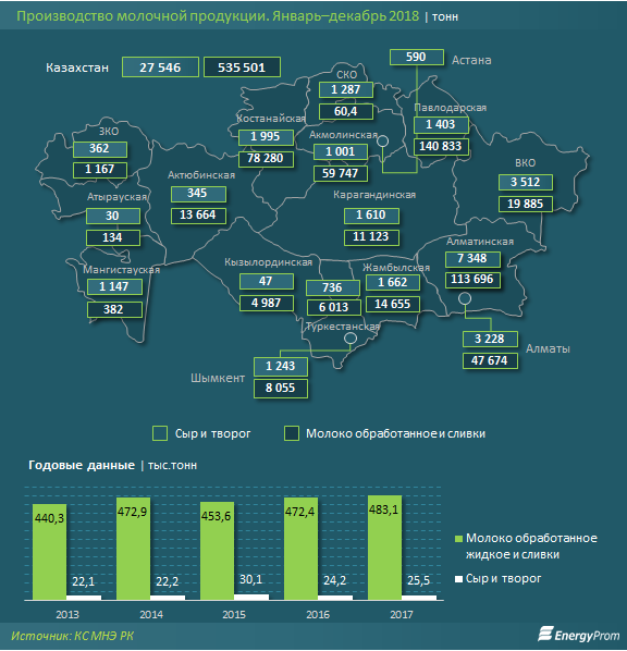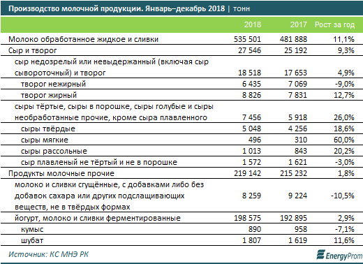 По итогам прошлого года казахстанские компании увеличили выпуск молока и сливок на 11,1% за год, до 535,5 тыс. тонн, сыра и творога — на 9,3%, до 27,5 тыс. тонн.