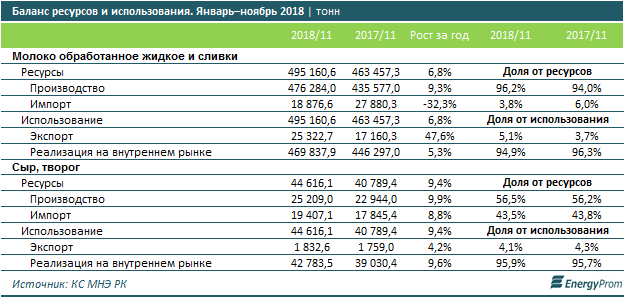 За 11 месяцев 2018 года казахстанские компании обеспечили спрос на молоко и сливки на 96,2%, против 94% в аналогичном периоде годом ранее; на сыры и творог — на 56,5%.