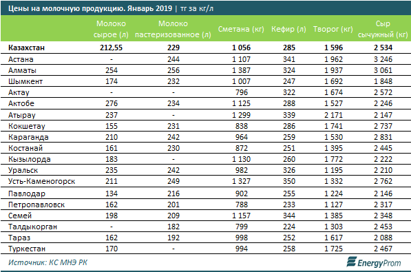Цены на молочную продукцию в магазинах страны по итогам января 2019-го выросли за год: на 6,8% — на сырое молоко (до 212,6 тг за литр), на 6,5% — на пастеризованное молоко (до 229 тг за литр в среднем по РК), на 6,9% — на сметану (до 1055,5 тг за килограмм), на 5% — на кефир (до 285,2 тг за литр), на 6,4% — на творог (до 1596,4 тг за килограмм по итогам января), на 13,5% — на сыр (до 2534,4 тг за килограмм).