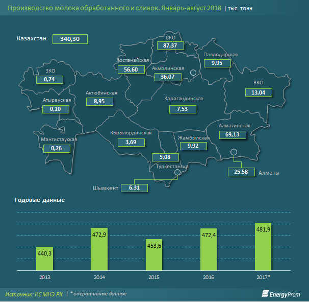 Почти две трети производства приходятся на три ключевых региона — СКО (25,7% от РК), Алматинскую (20,3%) и Костанайскую (16,6%) области.