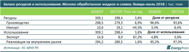 Казахстанские молочные предприятия обеспечивают спрос на молоко и сливки сразу на 96,6%, практически вытеснив с рынка весь импорт (объемы ввезенной продукции по итогам 7 месяцев сократились год-к-году сразу на 44,5%).