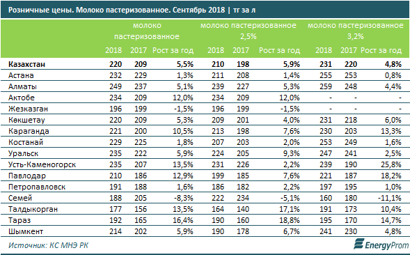 Розничные цены на пастеризованное молоко составляли к октябрю текущего года в среднем по РК 220,2 тг за литр — на 5,5% больше, чем годом ранее.