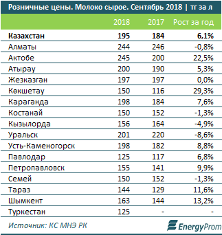 Сырое молоко подорожало сильнее — на 6,1% за год. По итогам сентября цена за литр достигла уже 194,9 тенге.